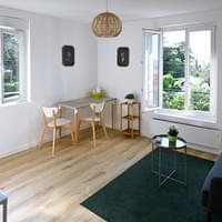 L’appartement d’une surface de 27 m² est situé au premier étage droite de La Petite Sommière avec vue sur le jardin et la forêt.